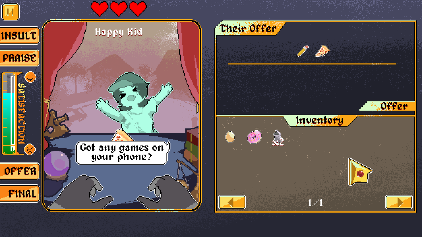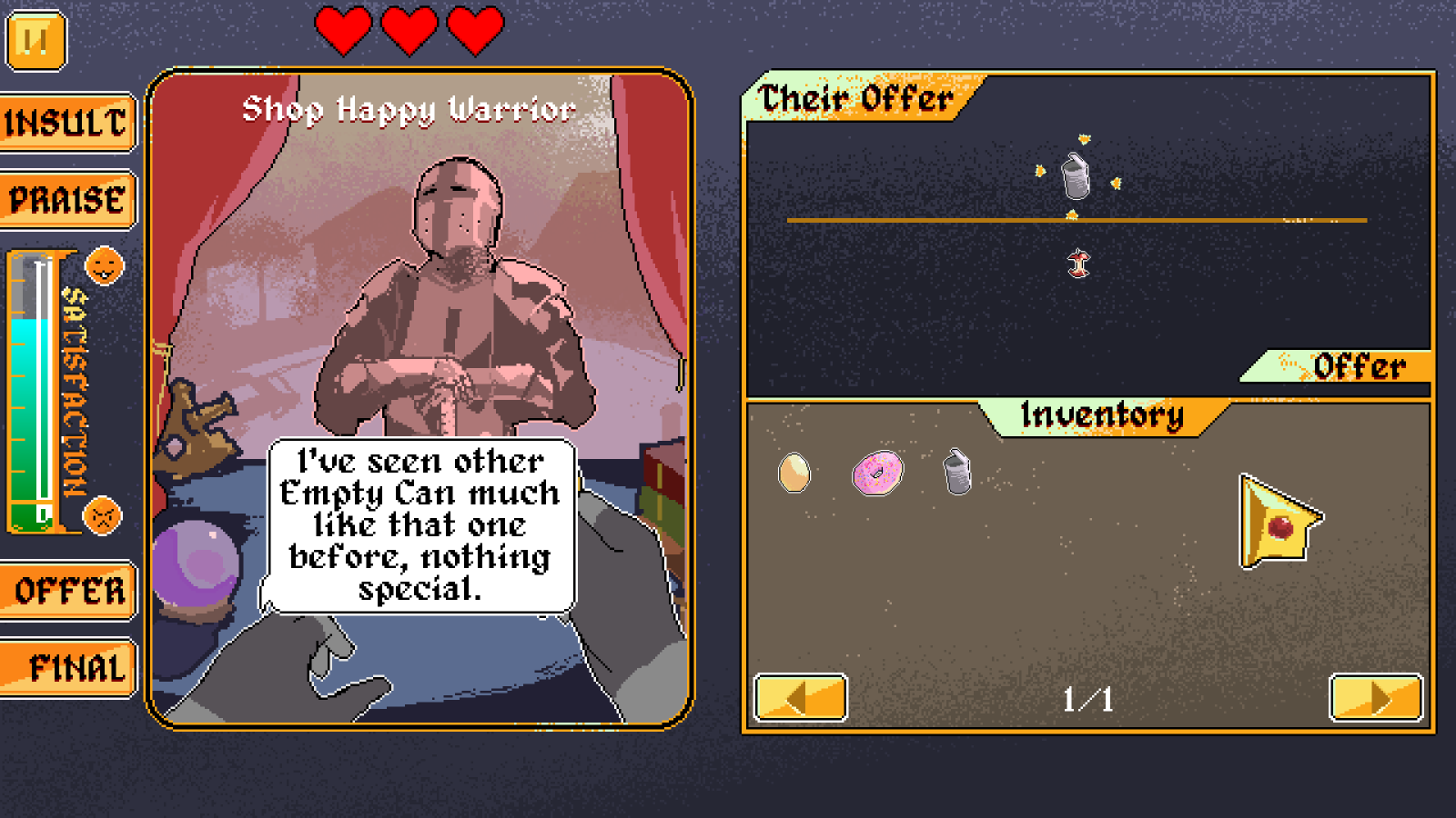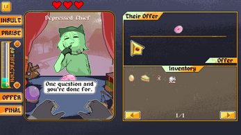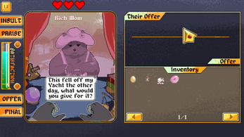 - You can haggle (praise/insult) an item you've selected, haggling can influence the value the NPC gives to the item when successful